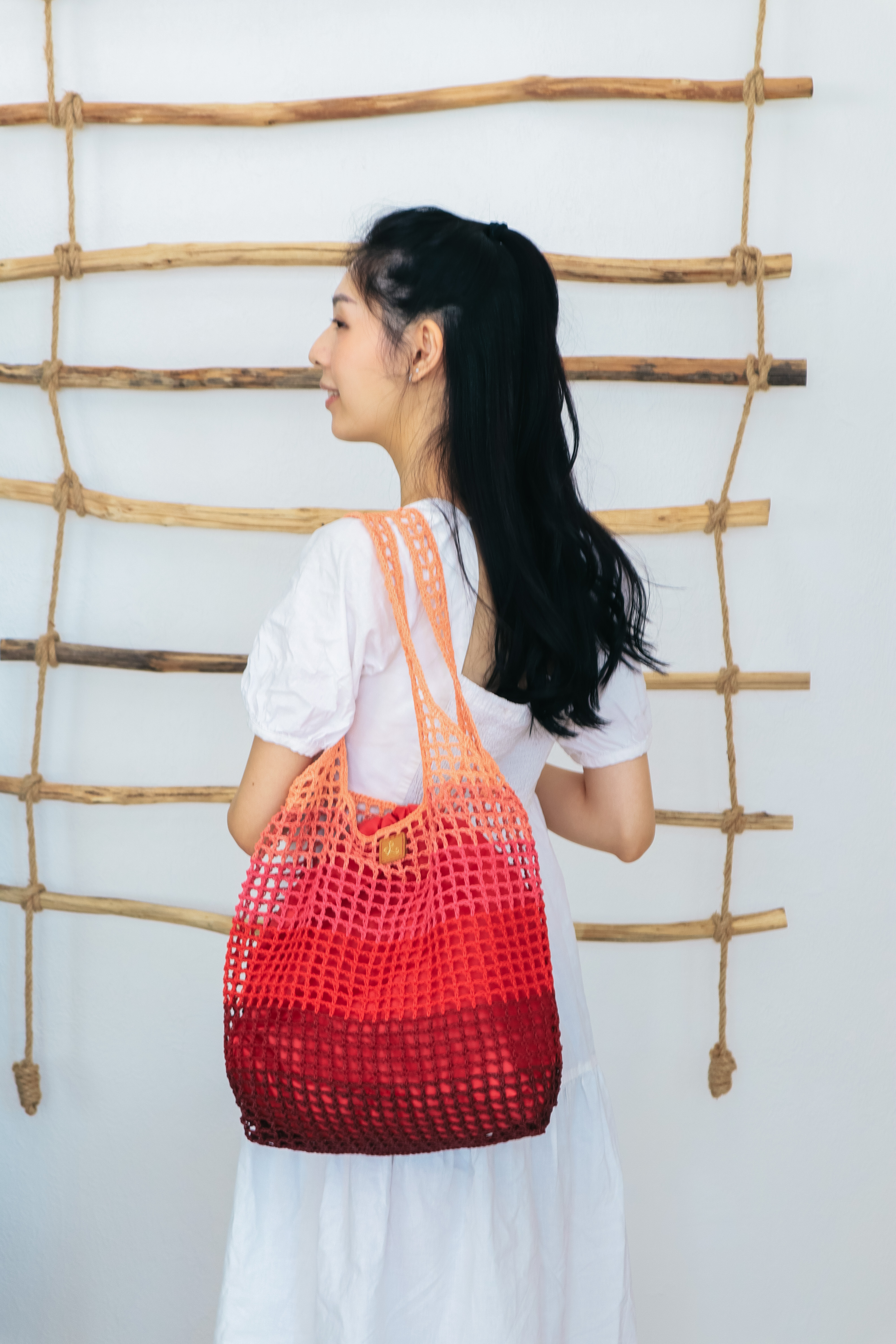 網袋是近年潮流炙熱包包,設計師從不落後,也創作了兩款通花網袋,選擇方格图案鈎針法,全方位通孔格仔,採用具靭性的腊棉繩材料鈎織,內配置索口袋,讓成品更具可塑形態,既輕且實用,十種顏色任你訂購