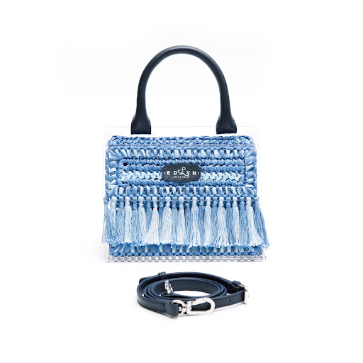 Designer combines different sizes and mixture of crochet panels assembly together with frame. The fringes on flap feature bringing this small tote very cute and dynamic. * Cotton raffia / polyester cord with ACRYLIC frame * Genuine Cow Leather Handles and Straps * Body Measurement: 19.5cm x 15.5cm x 9cm * Leather Handles: 9cm drop * Leather Strap: Detachable, Adjustable from 56cm to 60cm drop * Colors: Coral/Sky Blue/Navy/Natural